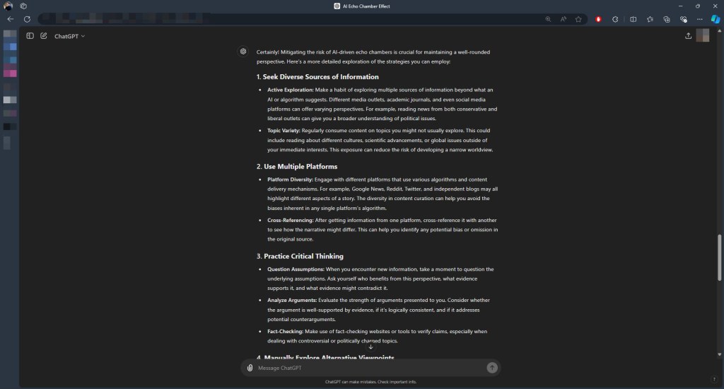 In the end, overcoming AI echo chambers depends on our ability to recognize when we might be wrong and remain open to new ideas. A positive, growth-oriented mindset sees differing opinions not as threats but as opportunities to learn and improve, ultimately optimizing AI as a valuable tool.