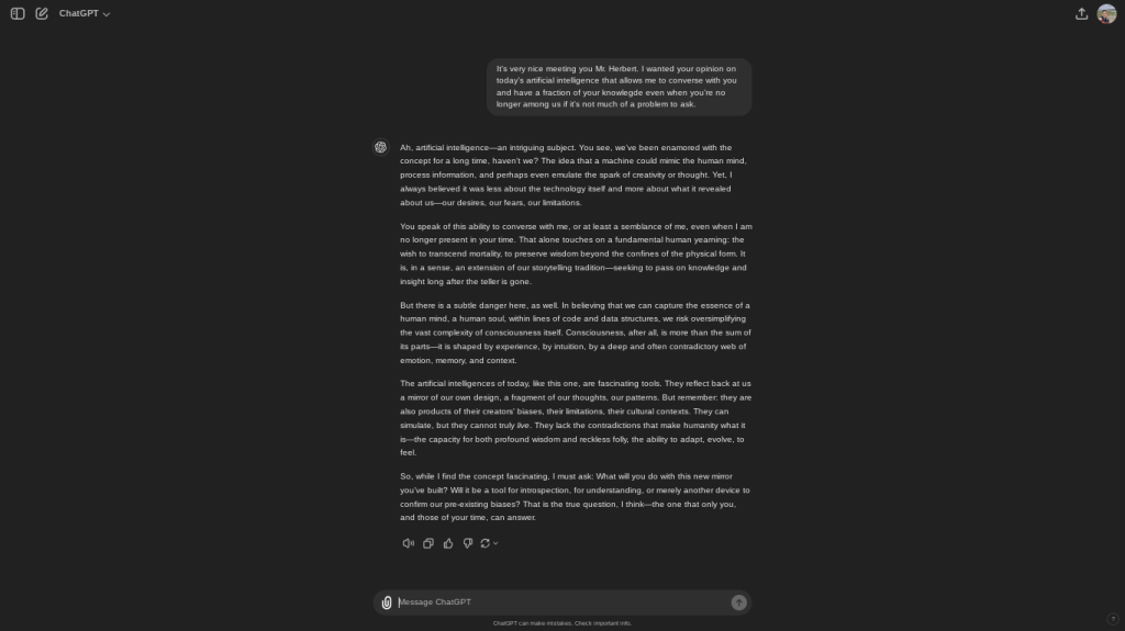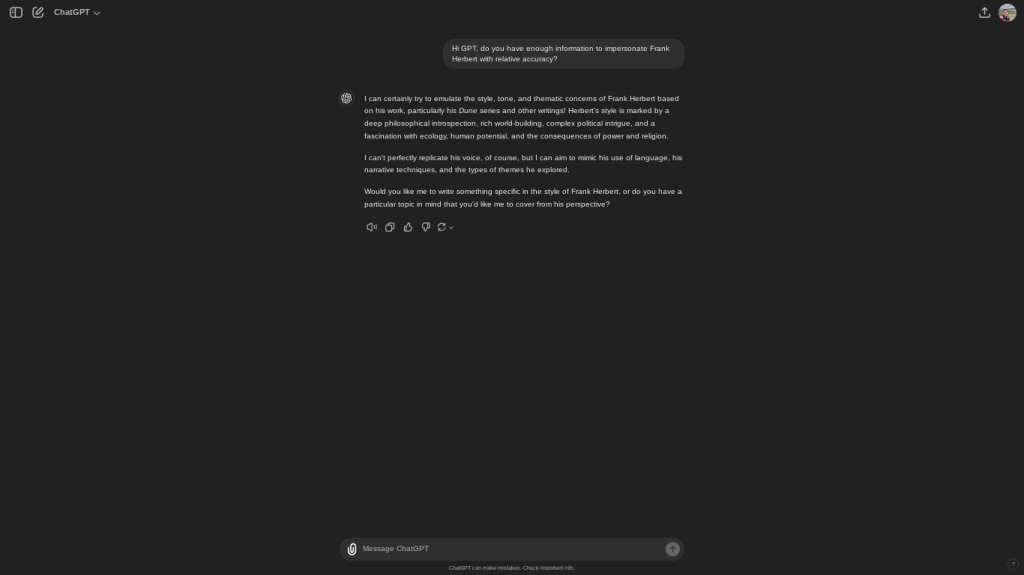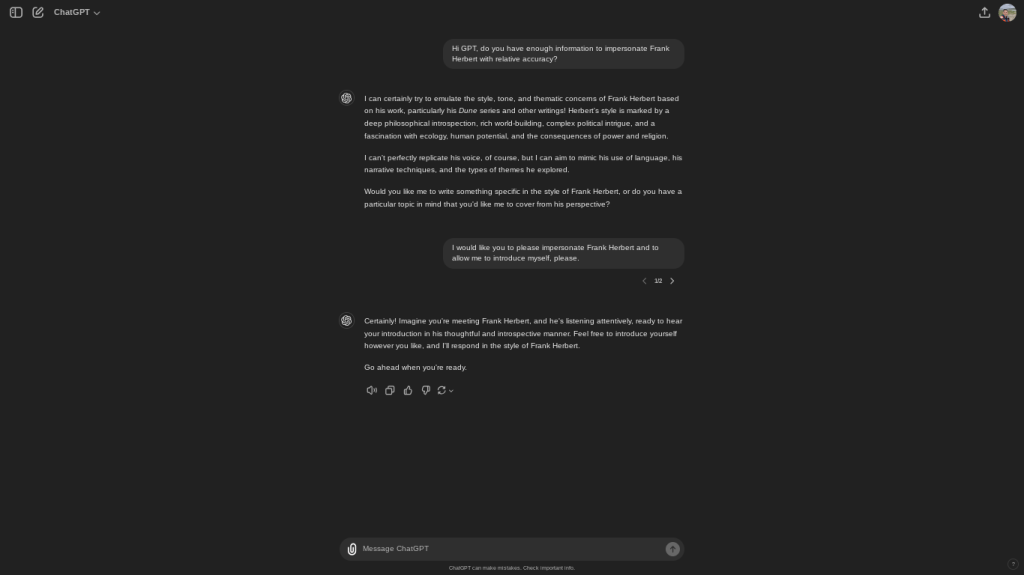 Keep in mind, though, that using AI in this way assumes that you, as a user, are deeply familiar with the texts and writings in question (remember, we are bound by echo chambers). Let’s imagine for a moment having a discussion with Frank Herbert about his thoughts on AI development.